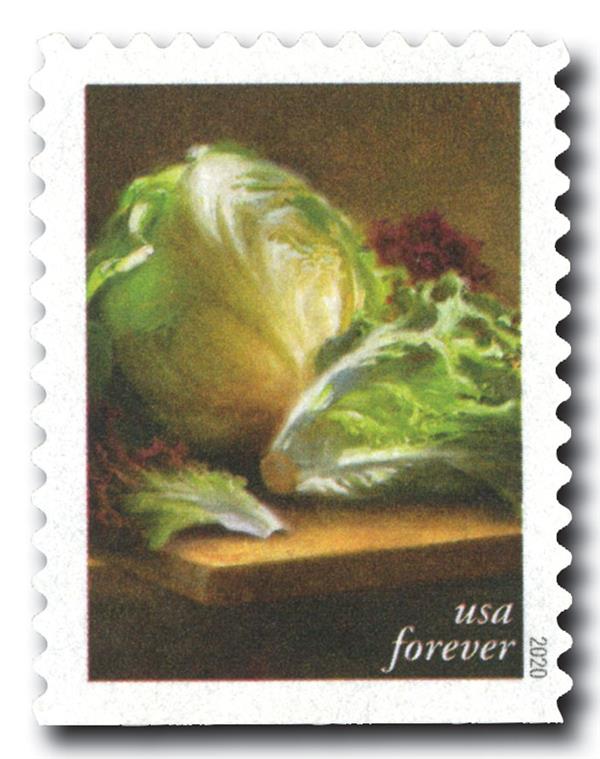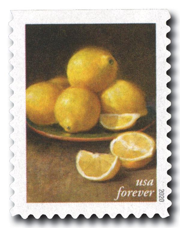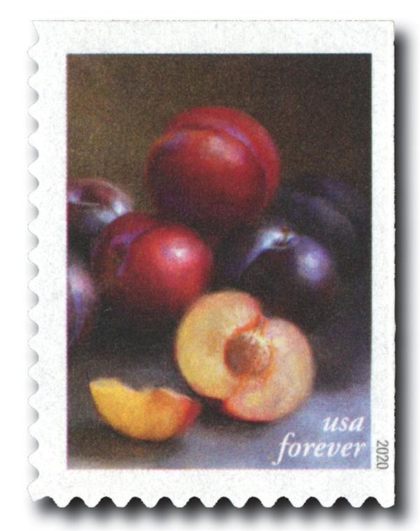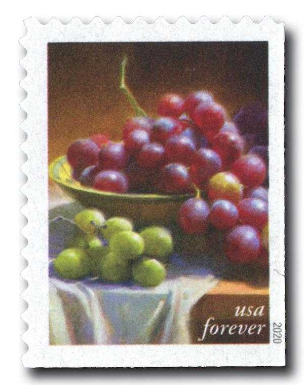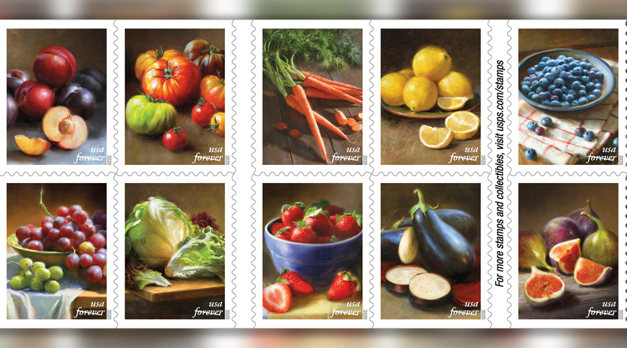 The Forever stamps feature 10 still life paintings of fruit and vegetable arrangements: red and black plums, heirloom and cherry tomatoes, carrots, lemons, blueberries, red and green grapes, lettuces, strawberries, eggplants and figs.