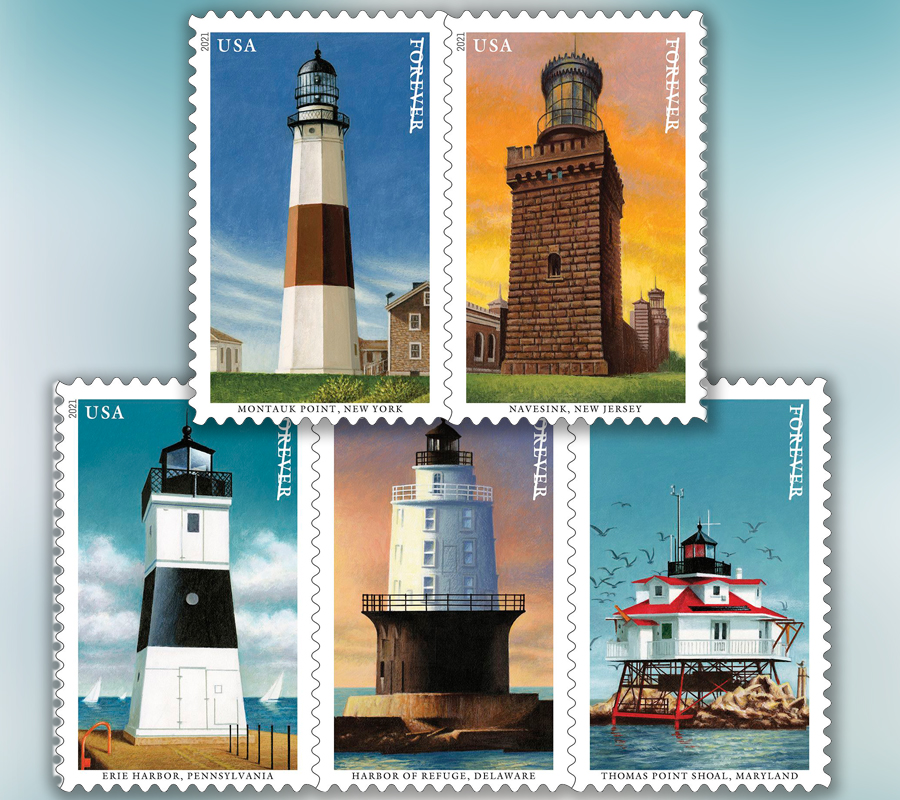 In 2021, the United States Postal Service issued five Forever stamps picturing Mid-Atlantic lighthouses. These included Montauk Point Lighthouse, Navesink Twin Lighthouses, Erie Harbor Pierhead Lighthouse, Harbor of Refuge Lighthouse, and Thomas Point Shoal Lighthouse. These stamps bring lighthouses to public attention and remind us all that these beautiful and antique structures are pieces of our nation's history we all need to fight to save.