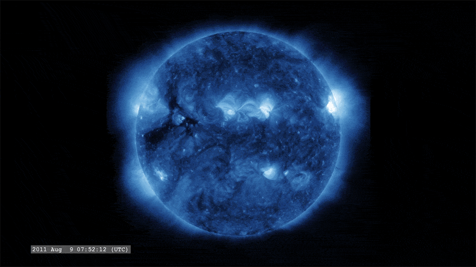 The bright flash above and to the right of the Sun is a powerful X-class solar flare. X-class flares are the most powerful type of solar flare, and these bursts of light and energy can disrupt the part of Earth's atmosphere where GPS and radio signals travel. These images were taken on August 9, 2011 at an extreme ultraviolet wavelength of 335 angstroms.