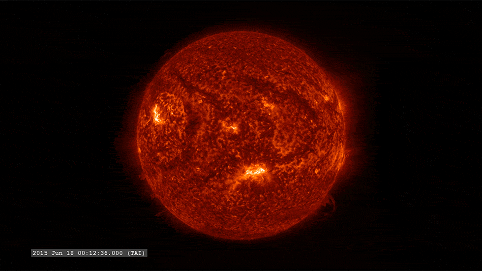Visible to the lower right of the Sun is a prominence, its bright arcs traced by charged particles circling along the Sun's magnetic field lines. Coronal loops often appear above sunspots and active regions, regions of strong and complex magnetic fields on the sun. These images were taken on June 18, 2015 at 304 Angstroms, an extreme ultraviolet wavelength.