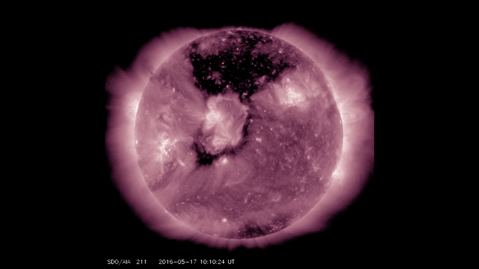 The dark region covering the sun's north polar region is a coronal hole, an open region of the sun's magnetic field from which the high-velocity solar wind escapes into space. When this high-velocity solar wind collides with our planet's magnetic field, they can trigger spectacular auroras here on Earth. These images were taken between May 17-19, 2016, and the image on the stamp was taken on May 17. The image shows the Sun at 211 Angstrom light, a wavelength of extreme ultraviolet light. This light is invisible to our eyes and is absorbed by the Earth's atmosphere, so it can only be seen by instruments in space.