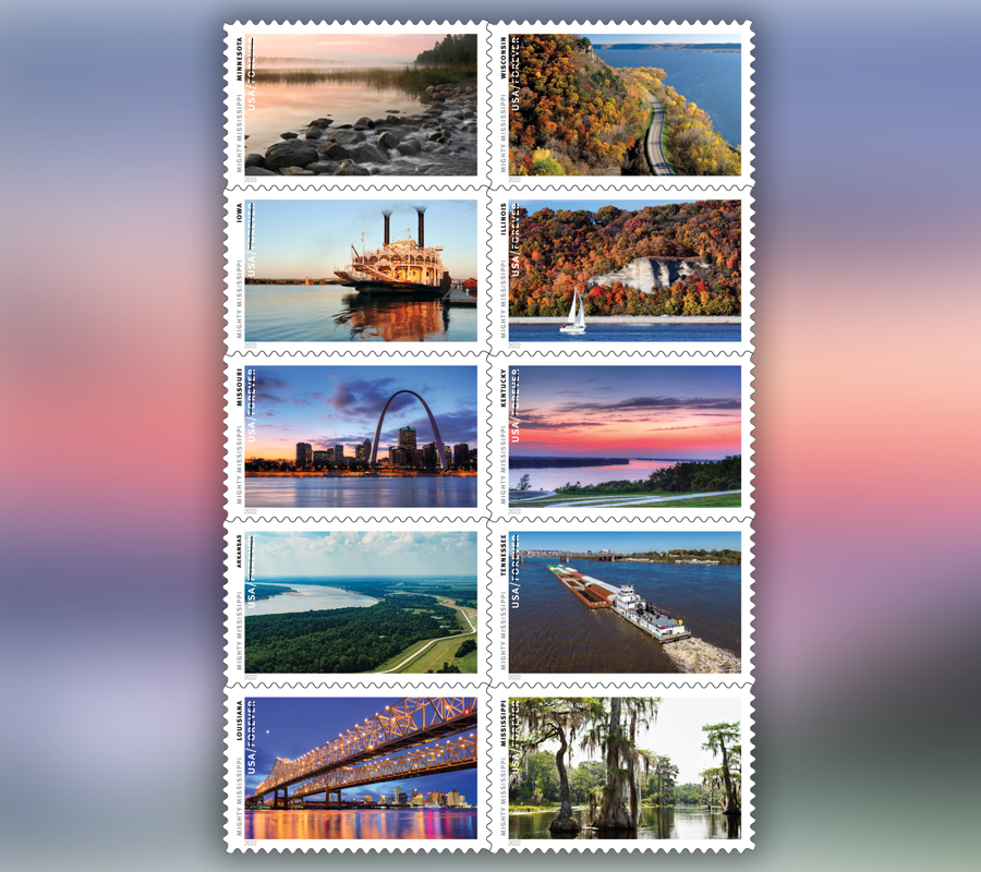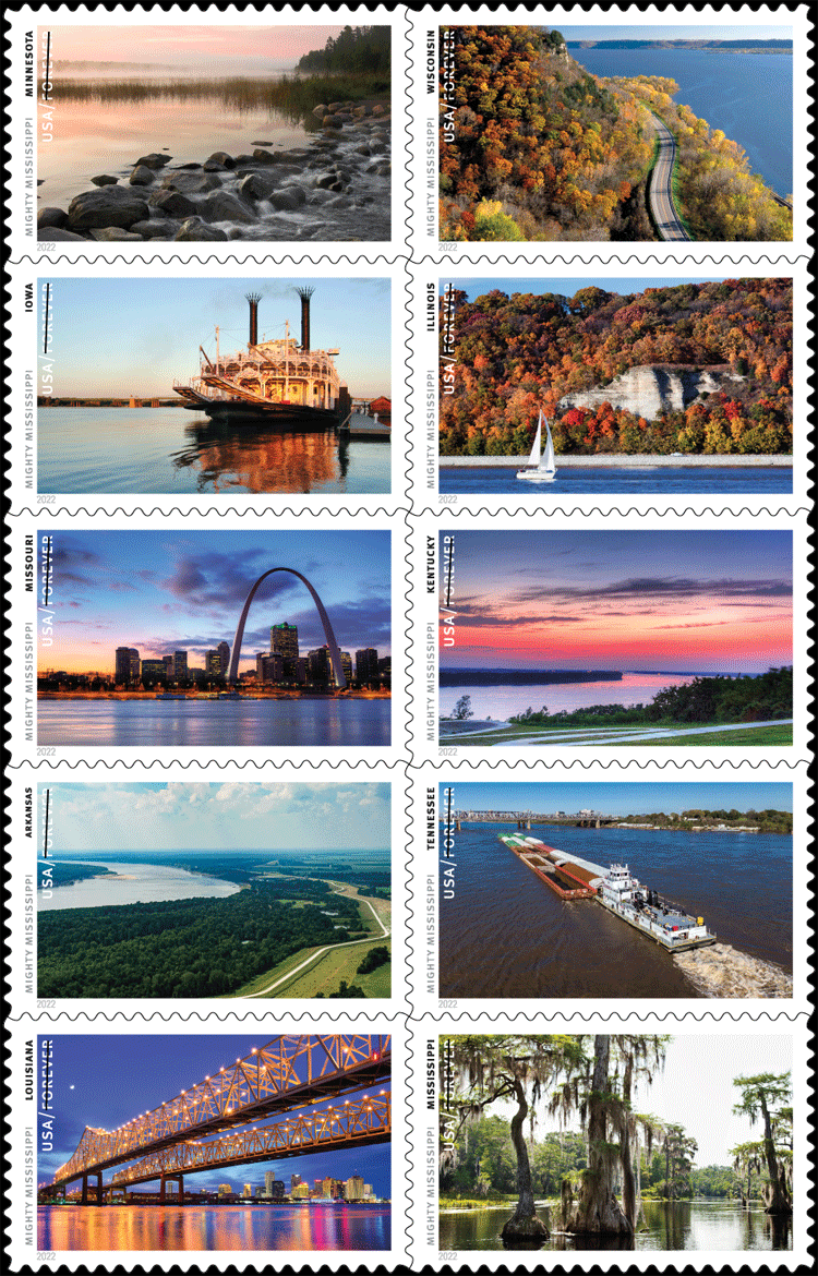 In 2022, the United States Postal Service issued a set of 10 Forever stamps honoring the Mighty Mississippi.  Each stamp design represents a different state that the river passes through.  The stamps picture the quiet scenic views of the Upper Mississippi as well as the bustling transportation highway that is the Lower Mississippi.  There's also a stamp picturing the Great River Road.  This series of connected roads follows the Mississippi River all the way from Minnesota to Louisiana.  One design pictures a vintage steamboat, an iconic symbol of the American South.  There's also a modern barge transporting goods, an impressive bridge spanning the width of the river, and stunning wetland habitat supported by the river's floodplain.