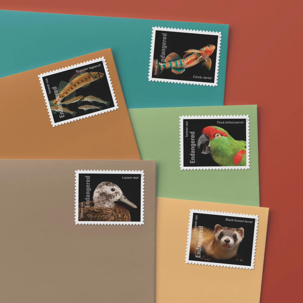 The word “Endangered” and the common name of the pictured species is printed on each stamp. The pane’s selvage features a larger version of the Roanoke logperch photograph with the issuance title, “Endangered Species.”