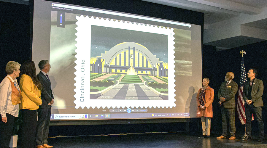 Each stamp in the pane of 20 is an illustration of a single station: the 1874 Tamaqua Station in Tamaqua, Pennsylvania; the 1875 Point of Rocks Station in Point of Rocks, Maryland; the 1901 Main Street Station in Richmond, Virginia; the 1918 Santa Fe Station in San Bernardino, California; or the 1933 Union Terminal in Cincinnati, Ohio. Passenger trains stop at all of them except Tamaqua. The pane resembles a page in an old-fashioned photo album, with the title “Historic Railroad Stations of the United States” and drawings of a train and a one-ride ticket in the header.